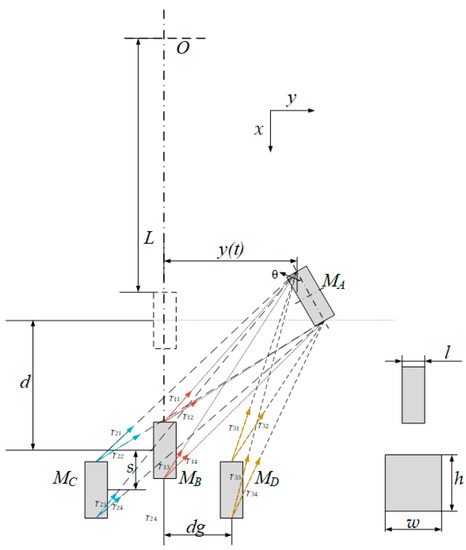 In the formula, σ 1 = y ( t ) , σ 2 = y ( t ) + h a θ , σ 3 = y ( t ) + d g , σ 4 = y ( t ) + h a θ + d g , σ 5 = y ( t ) d g , σ 6 = y ( t ) + h a θ d g . The displacement of the free end of the composite beam in the y-axis direction at time t is y ( t ) . M A , M B , M C , and M D are the magnetization of magnets A, B, C, and D, respectively. S B , S C , S D , and S A are the surface areas of magnets B, C, D, and A facing each other, and the deflection angle θ of magnet A and displacement y ( t ) satisfy the following relationship: