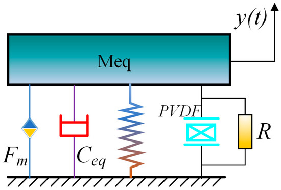 When the composite beam is in the first-order bending vibration mode, the piezoelectric energy harvester obeys the law of energy conservation, and the IBPEH model can be equivalently transformed into a lumped parameter model. Figure 4 is the lumped parameter model diagram of the IBPEH system, where M e q represents the equivalent mass of the system, C e q represents the equivalent damping of the system, R represents the PVDF external resistance, and F m represents the magnetic force received by the magnet A.