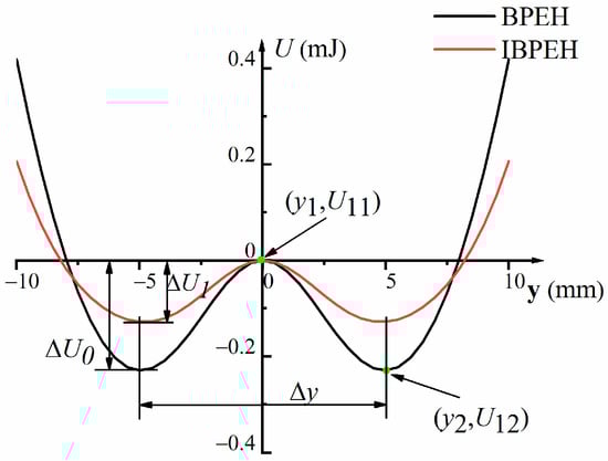 The total potential energy of the BPEH system is U 1 = U m 1 + U r . We selected d = 18 mm and set the highest point of the barrier ( y 1 , U 11 ) and the lowest point of the potential well ( y 2 , U 12 ). From the potential energy curve of the BPEH system, we can obtain