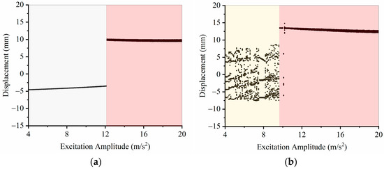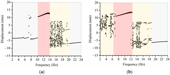 It can be seen from Figure 6 that when the excitation frequency is in the range of 2–6.3 Hz, the BPEH system performs small-amplitude intrawell oscillation, and the IBPEH system performs chaotic motion. Combined with Figure 7, it can be seen that the RMS voltage produced by IBPEH is larger than that of BPEH, which is caused by the existence of some large-amplitude interwell and small-amplitude intrawell motions in chaotic motion. When the excitation frequency is greater than 6.3 Hz, IBPEH can adapt to this excitation frequency, and the system changes from chaotic motion to large-amplitude interwell periodic motion. Combined with Figure 7b, it can be seen that the RMS voltage produced by IBPEH is improved, while BPEH still maintains small-amplitude intrawell oscillation. When the excitation frequency continues to increase to f = 10.2 Hz, BPEH transitions from small-amplitude intrawell motion to large interwell periodic motion state and the RMS voltage increases significantly, while the IBPEH system continues to maintain large-amplitude interwell periodic oscillation. The operating frequency bandwidth of BPEH is 3.2 Hz in the state of large-amplitude interwell periodic motion, and the operating frequency bandwidth of IBPEH is 6.1 Hz. Continuing to increase the excitation frequency, after the large-amplitude interwell periodic motion of the system ends, the BPEH and IBPEH will decay from the large-amplitude interwell periodic motion state to the chaotic motion state. Because the system is difficult to adapt to the higher excitation frequency, small-amplitude intrawell motion is finally performed. The above analysis shows that before the system realizes large-amplitude motion, the IBPEH behaves in a state of chaotic motion. In this state, the response output of the energy harvester is between the motion state of small-amplitude intrawell and large-amplitude interwell. Compared with BPEH, IBPEH can achieve high-energy yield at a lower excitation frequency, and the operating frequency bandwidth is broadened by 93.55 % .