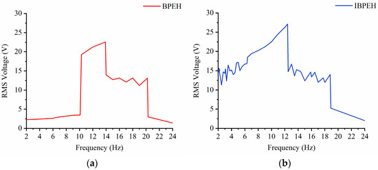 Figure 7. RMS voltage diagram with excitation frequency as parameter: (a) BPEH; (b) IBPEH.