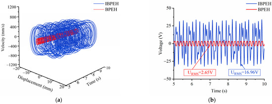 When f = 11 Hz, increase the excitation amplitude to A = 11 m/s2. Figure 14a,b shows the simulation results of time-domain velocity versus the displacement and the voltage–time diagram, respectively. It can be seen from Figure 14a that the BPEH is still in a small-amplitude intrawell motion state, while IBPEH has achieved a large-amplitude interwell periodical motion state, and the response displacement and velocity have been greatly improved. Combined with Figure 14b, IBPEH can continuously produce voltage with high energy, and the RMS voltage produced is 8.07 times that of BPEH. It fully demonstrates the performance of IBPEH that can achieve high efficiency produced under the condition of lower excitation amplitude.