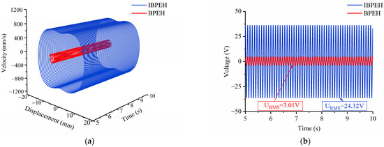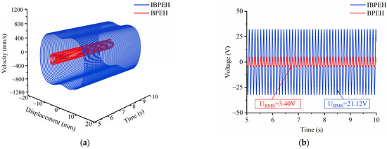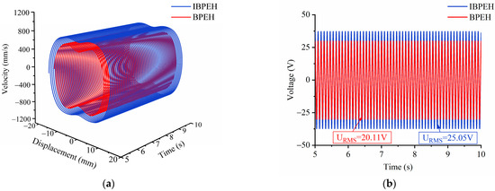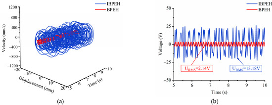 Continue to increase the excitation frequency to f = 12 Hz, and keep A = 14 m/s2. Figure 10a,b shows the simulation results of time-domain velocity versus the displacement and voltage–time diagram, respectively. From this figure, it can be seen that both BPEH and IBPEH systems can achieve large-amplitude interwell period motion, and the response displacement and speed of the system have been greatly improved. Compared with BPEH, the RMS voltage of the IBPEH is increased by 23.51 % .