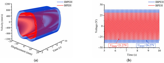 When f = 11 Hz, continue to increase the excitation amplitude to the condition of A = 14 m/s2. Figure 15a,b shows the simulation results of time-domain velocity versus the displacement and the voltage–time diagram, respectively. It can be seen from Figure 15a combined with the bifurcation diagram in Figure 11 that both BPEH and IBPEH are in a state of large-amplitude interwell periodic motion under this excitation condition. Concerning Figure 15b, it can be seen that BPEH and IBPEH can continuously yield voltage with high energy. Compared with BPEH, the RMS voltage produced by IBPEH increased by 24.56%.