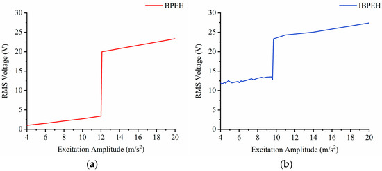 Figure 12. RMS voltage diagram with excitation amplitude as parameter: (a) BPEH; (b) IBPEH.