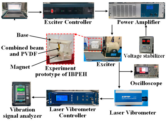 In order to verify the correctness of the simulation results, an experimental prototype is made and an experimental platform is built in this paper. Figure 16 shows the experimental prototype and experimental platform. On this basis, magnet C and magnet D are removed as the BPEH system test platform. The IBPEH system test platform is mainly composed of a computer, voltage stabilizer, exciter controller (VT-9008, ECON, Hangzhou, China), power amplifier (VSA-1000A, ECON, Hangzhou, China), exciter (LT-50ST, ECON, Hangzhou, China), oscilloscope (DSOX3024T, KEYSIGHT, Santa Rosa, CA, USA), laser vibrometer (LV-S01, SDPTOP, Shanghai, China), laser vibrometer controller (LV-S01, SDPTOP, Shanghai, China), and vibration signal analyzer (COCO80X, CRYSTAL, Silicon Valley, CA, USA). The experimental prototype consists of a base, a linear-arch composite beam, a PVDF film, and a magnet. PVDF is evenly bonded to the surface of the composite beam. One end of the composite beam is fixed on the top of the base, and the other end is bonded with magnet A. Magnet B is placed on the fixed end of the base, and magnet C and magnet D are placed symmetrically on both sides of magnet B.