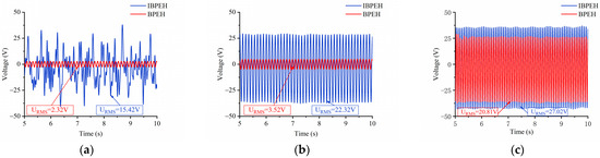 Figure 17a–c shows the simulation results of time-domain velocity versus the displacement when A = 14 m/s2 and the excitation frequency is 6 Hz, 9 Hz, and 12 Hz, respectively. Figure 18a–c shows the voltage–time diagrams of A = 14 m/s2 and excitation frequency of 6 Hz, 9 Hz, and 12 Hz, respectively. It can be seen from Figure 17 combined with Figure 18 that the IBPEH system exhibits chaotic motion under the condition of an excitation frequency of 6 Hz, and the RMS voltage produced by IBPEH is 15.42 V. BPEH is small-amplitude intrawell motion state, and the RMS voltage is only 2.32 V. When the excitation frequency is increased to 9 Hz, the IBPEH system can adapt to this frequency and perform large-amplitude interwell motion, and the RMS voltage is 22.32 V, while the BPEH still maintains small-amplitude intrawell motion, and the RMS voltage is only 3.52 V. The RMS voltage of IBPEH is 6.64 times and 6.34 times that of BPEH RMS voltage in turn. Continuing to increase the excitation frequency to 12 Hz, both BPEH and IBPEH show a state of large-amplitude intrawell periodic motion, the RMS voltage produced by BPEH is 20.81 V, and the IBPEH is 27.02 V. Under this excitation condition, the RMS voltage produced by IBPEH is 29.84% higher than that of BPEH, and the experimental results are in agreement with the theoretical analysis results.