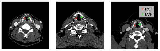 Right and left vocal folds (RVF and LVF) shown in axial slices of three neck CT volumes.