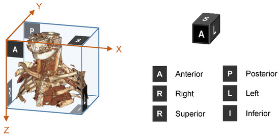 Cartesian axes directions in neck CT volume. On the left, volume rendering of a neck CT using RadiAnt Dicom Viewer (http://www.radiantviewer.com (accessed on 15 December 2022)) is shown with axes annotation.