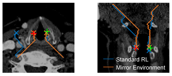 The proposed mirror environment is solely based on the laryngeal symmetry where each of the two vocal folds is almost a mirrored version of the other. We first model the left vocal fold in volume V as the right fold in volume , a laterally (along the X-axis) flipped version of the original volume V. Then, we propose a single RL agent to localize both the right vocal fold (as ) and left vocal fold (as ), essentially arguing and to be the same target landmark with similar features.