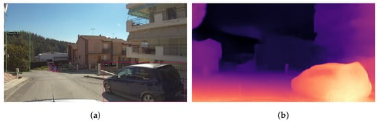 To estimate the location of an object with this approach, we first apply the object detection models to localize it in the frame (Figure 2a) and then we calculate the distance of the object from the camera by applying the depth estimation model (Figure 2b). Having the object’s bounding box and the respective pixel-level absolute depth in meters, we calculate the median depth value for every object localization to compute the distance []. Knowing the object’s distance d from the camera and the camera’s GPS coordinates we can also infer the bearing from the direction of the car and camera and the object localization in the frame. Let R be the radius of Earth and be the angular distance i.e., The resulting coordinates in radians are given from the following formulas: