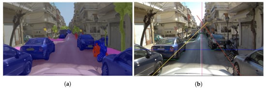 The width of the roads in one region can be an important feature for many statistical analyses. StreetScouting supports the automatic road width estimation in each frame. Additionally, the existence of sidewalks is evaluated. A segmentation model is initially used to semantically segment the frame. Specifically, we use the DeepLabv3+ [] segmentation model. This model combines a Spatial pyramid pooling module and encode–decoder structure to obtain the advantages of both methods. It also applies the depth-wise separable convolution to both atrous spatial pyramid pooling and decoder modules, resulting in a faster and stronger encoder–decoder network. This architecture is used pre-trained in the cityscapes [] dataset. Cityscapes is a dataset for semantic urban scene understanding and it contains several classes, such as the BDD100k dataset. The effectiveness of the model is assessed on the test subsets of the PASCAL VOC 2012 [] and Cityscapes datasets, accomplishing the performance of 0.89 and 0.821 mean IoU, respectively. An example outcome of the model is shown in Figure 3a. Road and sidewalk classes are overlaid with purple and pink colors respectively. Using just this result we can infer whether there is a sidewalk in the frame.