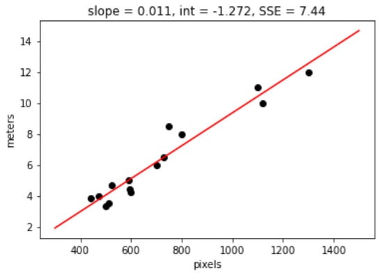 For the final estimation, we calculate the number of pixels among the two boundaries for a specific horizontal line (blue line). Then we fit another linear regression model associating the pixels with ground truth measurements in meters. For fitting the model we use 15 training samples with the number of pixels and corresponding ground truth values in meters. To obtain ground truth values, we manually measured the width of various streets. The fitted linear regression model and its details are shown in Figure 4. The sum of squares error is 7.44, the slope is 0.011 and the intercept is −1.272.