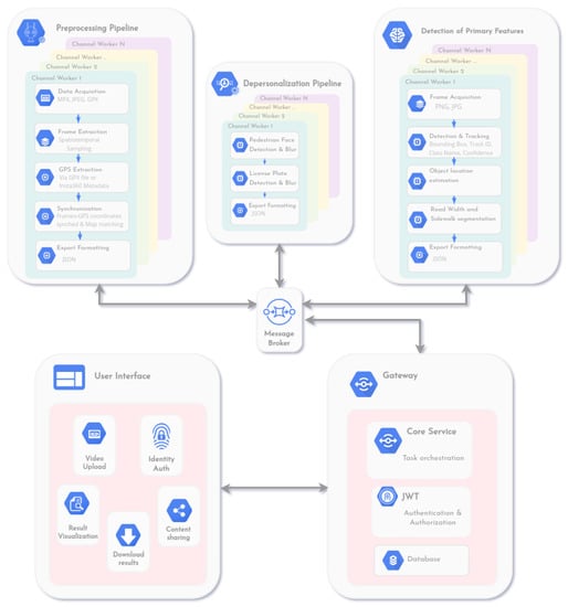 The gateway is the core management service and is utilized as an intermediary between the user interface and the modules responsible for urban feature detection. It is in charge of most of the platform’s actions, such as user creation and authentication, action authorization, video upload, and others. The gateway also acts as an orchestrator between the modules. Specifically, it stores the uploaded multimedia from the user and informs the appropriate modules to start the processing, depersonalization, and detection procedures. Upon completion of the processes, the resulting JSON file is returned to the gateway and successively back to the user interface. The aforementioned JSON file can be shared among users as well as utilized for visualization purposes. The communication between the modules is performed with a message broker.