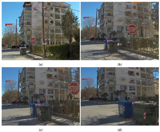 Motivated by this observation, we randomly sampled 1000 frames from the dataset that is described in the previous subsection and we manually annotate particular objects. The annotation involves objects that are not present in popular open-sourced datasets. More specifically, the objects that are annotated are trees, trash bins, recycling bins, street lighting poles, and shops. 5228 total object instances of interest are annotated, as seen in Table 1. We refer to this dataset as the GRUBLES objects dataset. The CVAT (https://github.com/opencv/cvat, accessed date 29 November 2022) annotation tool is used for the labeling process. A useful feature of CVAT is the ability to export labeling data in a wide range of different formats, from YOLO to PascalVOC annotation formats.