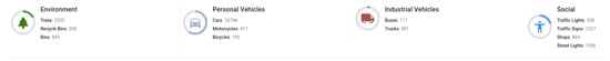 After video processing, the UI provides helpful visualizations for the user. For instance, Figure 8 shows count aggregations of each detected urban class for a sample 60-min video in the city of Thessaloniki. The detected urban classes are aggregated into four general categories. This visualization gives a quick overview of the results but also can be helpful to extract insights for the region. For example, the 10,745 cars detected might be indicative of traffic congestion or parking problems in the region.