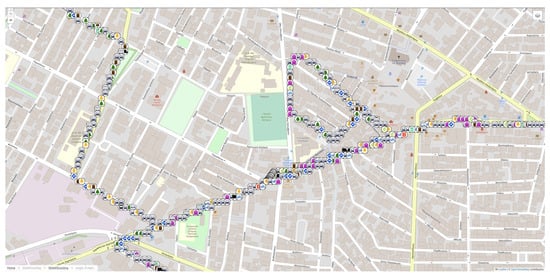 Additionally, StreetScouting also supports map visualization and navigation (Figure 9). The user can navigate the map and inspect the geotagged urban features. Each object is denoted by a particular urban class icon. The user can also filter results to examine specific object classes and click on particular objects to obtain details regarding the detection. The user can download the data in JSON format to proceed with further analysis.