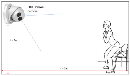 For the data acquisition, a low-cost RGB monocular camera was installed in two different nursing institutes [38]. The camera used in this work was the HIK-Vision DS-2CD2385FWD-I camera with a 2.8 mm focal length and a 4K resolution at 20 fps. The camera was installed in the gym of the institutes, where people usually execute mobility tests, so the medical staff periodically can monitor the motion abilities of older people following a defined protocol. The camera was placed as shown in Figure 2, at a height h = 2 m above the floor and a horizontal distance d = 3 m from the wall against which the chair was leaning. The camera was tilted down to an angle of about .