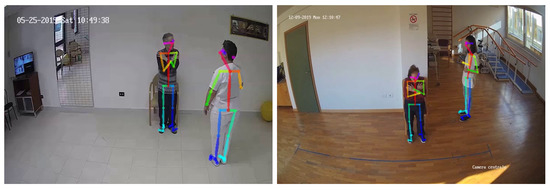 Then, the videos were processed to extract the skeletons of the observed people by using the OpenPose library [39]. OpenPose is a multiperson 2D pose estimation algorithm that detects the skeletons of all people present in the scene, returning the 2D coordinates of skeleton joints. In our study, the videos had to be analyzed to extract and track only the skeleton relative to the subject performing the StS test. Figure 3 shows two sample frames of the videos acquired in the two different nursing homes. The skeletons of other persons present in the scene, such as the physiotherapist or relatives, had to discarded. For this reason, a skeleton tracking procedure was developed to maintain only the skeleton information of the subject of interest while discarding the others.