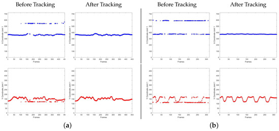Figure 4 shows the result of the developed tracking procedure. For the sake of clarity, only the coordinates of one joint (the nose) are plotted both in the case of a sick patient (Figure 4a) and a healthy subject (Figure 4b). As can be seen, before tracking, the coordinates of the joint are misaligned among skeletons. Once the skeleton of the patient is manually indicated in the first frame, the procedure tracks the skeleton in the entire video. Thus, after tracking, the joint coordinates are correctly assigned to the skeleton of interest.