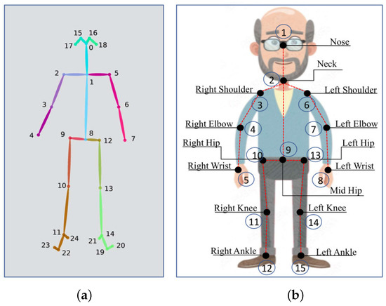 (a) Skeleton joints extracted by using Body_25 model in OpenPose. (b) Skeleton joints used in this study.