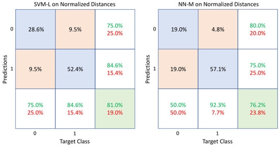 Confusion matrices of SVM-L and NN-M when normalized distances were used as feature vectors. The diagonal cells show the correctly classified observations (accuracies), whereas the off-diagonal cells show the incorrectly classified ones. The far-right column of each matrix shows the precision or positive predictive value (green) and the false discovery rate (red). The bottom row shows the sensitivity or true positive rate (green) and the false negative rate (red). Class 0 and class 1 represent healthy subjects and sick patients, respectively.