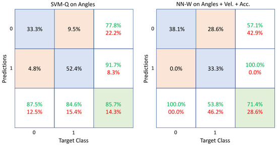 Confusion matrices of SVM-Q and NN-W when angles and angles plus velocity and acceleration were used as feature vectors, respectively. The diagonal cells show the correctly classified observations (accuracies), whereas the off-diagonal cells show the incorrectly classified ones. The far-right column of each matrix shows the precision or positive predictive value (green) and the false discovery rate (red). The bottom row shows the sensitivity or true positive rate (green) and the false negative rate (red). Class 0 and class 1 represent healthy subjects and sick patients, respectively.