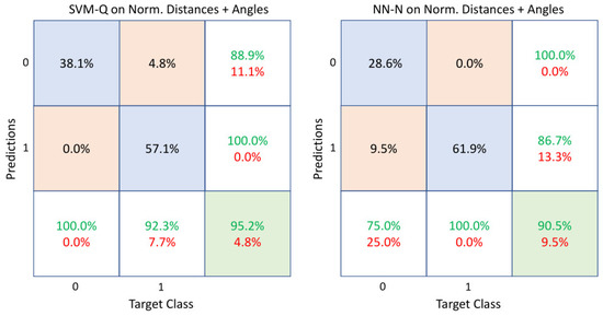 Confusion matrices of SVM-Q and NN-N when the combination of normalized distances and angles was used as a feature vector. The diagonal cells show the correctly classified observations (accuracies), whereas the off-diagonal cells show the incorrectly classified ones. The far-right column of each matrix shows the precision or positive predictive value (green) and the false discovery rate (red). The bottom row shows the sensitivity or true positive rate (green) and the false negative rate (red). Class 0 and class 1 represent healthy subjects and sick patients, respectively.