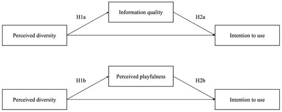 Both information quality (B = 0.799, SE = 0.219, p = 0.001) and perceived playfulness (B = 1.041, SE = 0.154, p < 0.001) were significant predictors of intention to use at the 0.05 significance level. Accordingly, Hypotheses 2a and 2b were supported (see Table 3). However, perceived diversity did not show significant effects directly on intention to use in both models, including information quality (B = 0.223, SE = 0.186, p = 0.240) and perceived playfulness (B = 0.070, SE = 0.145, p = 0.633).