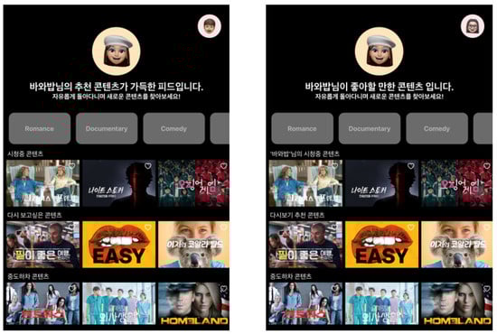 The prototype design and functionalities of the main page are described in more detail in Figure 4. First, an avatar and welcome message are shown at the top of the page. A menu is provided below that area to filter genres (romance, documentary, comedy, horror, and reality). If a participant selects one item, the list of recommended content below is provided for the selected genre. Below the genre area are lists of recommended content with their titles in each row. The title briefly describes the criterion on which the content was selected (e.g., watch it again, trending now, and continuing watching). When a thumbnail is clicked, the title of the content, seasonal information, and plot information are displayed. The entire content is composed of 210 items in total, and the first page consists of 35 items in seven rows, and each genre-specific page consists of 25 items in five rows.