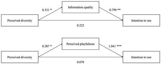 To test Hypotheses 1s and 2s, we conducted simple mediation analyses to validate whether information quality and perceived playfulness mediate the effect of diversity on the intention to use. Specifically, the effects of diversity in the social recommendations on information quality and perceived playfulness (H1a and H1b), as well as the mediating effects of these two variables on intention to use, were tested (H2a and H2b). Figure 5 shows the overall results of both the full models.