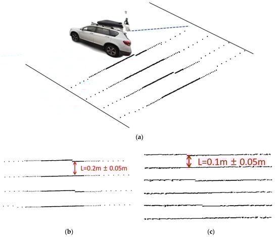 (a) Schematic diagram of data collected by mobile LiDAR line scan; (b) schematic diagram of the width between scanning lines of point clouds data collected by mobile LiDAR system in low-speed driving; (c) schematic diagram of the width between scanning lines of point clouds data collected by mobile LiDAR system in high-speed driving.