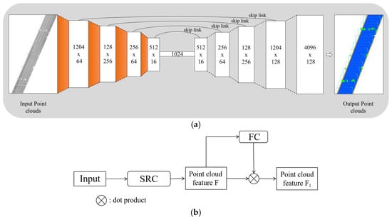 Based on the permutation and rotation invariance of point clouds, Qi et al. [] proposed Pointnet, which learns the features of points by sharing a multilayer perceptron (MLP) and then uses a symmetric pooling function to obtain global features. Based on the Pointnet [], a series of networks were proposed: Pointnet++ [] groups points by hierarchy and progressively learns from more significant regions. PointCNN [] proposes an X-transformation to first process the point clouds data so that it “regularizes” the data, and then using convolution operations, the point clouds is processed. Pointconv [] proposes a method that can efficiently perform convolution operations on non-uniformly sampled 3D point clouds data. GACNet [] creates a graph structure of each point and its surrounding points by introducing attention mechanism calculating the edge weights of the centroid and each neighboring point, thus enabling the network to achieve better results. PATs [] mainly improved the part of FPS in PointNet++ [] by adding a self-attention mechanism to select the down-sampled points at locations with high attention weights. Ma et al. [] proposed a capsule-based deep learning framework for extracting and classifying road markers from a large number of disordered MLS point clouds. Chen et al. proposed a deep learning model based on a dense feature pyramid network (DFPN) by combining the specificity and complexity of road markers []. Li et al. proposed a deep learning model using point clouds aggregated into a 2D image space and then transformed 2D projection using affine transformation for use in 3D LiDAR point clouds in rural accurate segmentation and extraction of road targets []. Ma et al. used multi-scale dynamic point-by-point convolution operations to provide an end-to-end feature extraction framework for 3D point clouds segmentation []. However, the existing deep learning network cannot accurately segment the sparse and non-uniform large-scale road field scenic spot cloud data collected by the high-speed mobile LiDAR system. Therefore, our research is based on enhancing the characteristics of sampling points in MLS point clouds data, specifically through adding an adaptive sampling radius module, enhancing the high-dimensional features of sampling points, and improving the segmentation accuracy of inhomogeneous sparse point clouds by deep learning network.