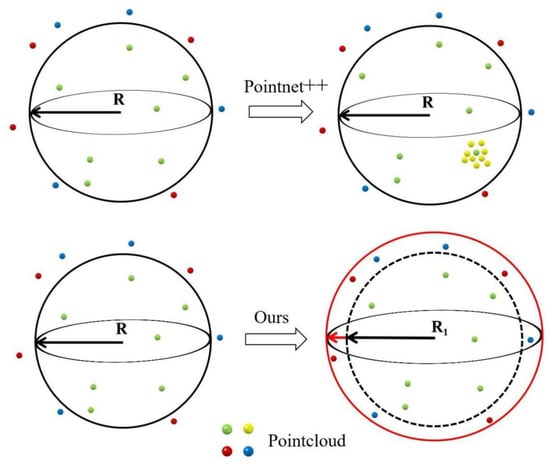 The Pointnet++ [] network uses an iterative farthest point sampling (FPS) method to select the centroids of a subset. However, in the process of using ball sampling, the number of all points in the ball radius is counted first, from which n points are selected as sampling points, and other points are discarded for processing; when the points in the ball radius do not reach n, the point with the largest value is copied to fill in. In indoor dense point clouds data, such processing can meet the requirements of feature learning. However, in the inhomogeneous sparse road extensive field point clouds data, it is easy to cause the loss of local information and the reduction of point clouds segmentation accuracy.