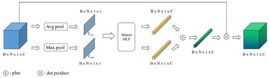where Mc ∈ ℝB×N×1×C is the point clouds channel attention mechanism, Fc is the output feature of point clouds channel attention, and ⊗ is the matrix fork multiplication. After obtaining the point clouds features, to generate the point clouds channel attention mechanism Mc, along the feature channel number N dimension, using average pooling can effectively obtain the holistic features of the point clouds, and using maximum pooling can effectively obtain more distinguishable point clouds features. Two types of pooling are used in the channel attention mechanism, and feature aggregation is performed on the point clouds data input features F to generate two different point clouds global features Favg and Fmax. In this paper, MLP is used to extract the point clouds features, and the features are trained using MLP with shared parameters, reduce the point clouds channel C first and then revert to the original, where the reduction factor is k. Finally, the required channel attention mechanism weights are obtained by Sigmoid.