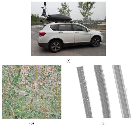 (a) Self-developed mobile LiDAR system; (b) experimental data collection area; (c) cloud data of road field points of interest.