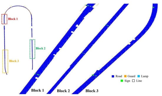 Figure 6 shows the qualitative experiment results of some areas selected from the Daxing Airport loop verification set. The road scene is divided into streetlights, signs, lane lines, pavement, and guardrails. We used MLS road field scenic spots such as Beijing–Taiwan Expressway, Beijing–Guangzhou Expressway, and Beijing South Sixth Ring Road to train our network model. The section of Daxing Airport loop was taken as a verification test to ensure the generalization of the fusion network model.