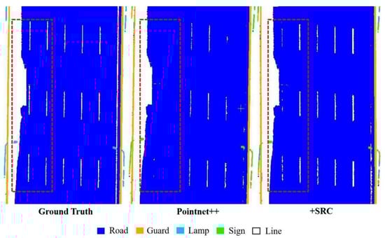 Visualization of segmentation results for the network with the adaptive radius sampling module (SRC) alone compared to the original Pointnet++. The improvement of the segmentation results for the distal sparse point clouds lane lines with the addition of the adaptive radius sampling module can be seen in the red dashed box.