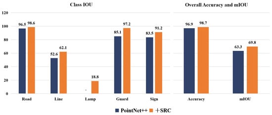 As can be seen from the bar comparison in Figure 9, the network testing accuracy with the addition of the SRC sampling module reached 98.7%, which is better than the original Pointnet++ [] network. In the test, the mIOU of the new network model replaced with the SRC sampling module reached 69.8%, which is better than the 63.3% of the original deep learning network. It indicates that under the same conditions, our method prediction yields more accurate results, more precise segmentation of sparse point clouds, and a significant improvement for features with less point clouds data such as streetlights. In addition to the correctness, our method maintains high accuracy in road point clouds tests in different regions. Therefore, it is inferred that our proposed method of adaptively varying the sampling radius is easier to learn the features of inhomogeneous sparse MLS road point clouds.