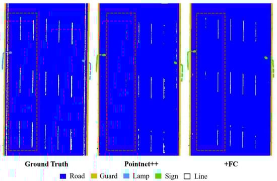 Visualization of segmentation results for the network with the channel attention mechanism module (FC) alone compared to the original Pointnet++. The improvement in segmentation results for the distal sparse point clouds lane lines with the addition of the channel attention mechanism module can be seen in the red dashed box.