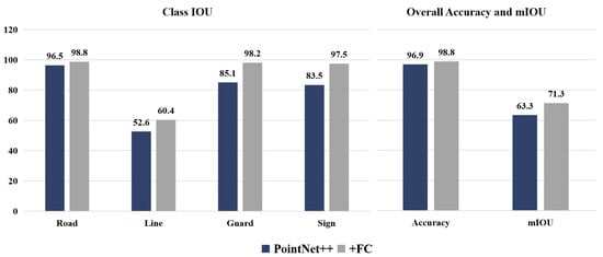 To verify the impact of the channel attention mechanism module on the original deep learning network, we added the channel attention mechanism to the original network model alone. In the same dataset for training and testing, Figure 10 shows that adding the channel attention mechanism also improves the performance of the native network model at the far end. In Figure 11, we find that the network with the channel attention mechanism (FC) alone also significantly improve in all aspects. Although the network model with FC did not segment the street light features with less point clouds data, the segmentation accuracy of lane lines and other features at the far end was improved. The OA and average mIOU were also improved, demonstrating that the channel attention mechanism can also have a positive effect on the native deep learning network.