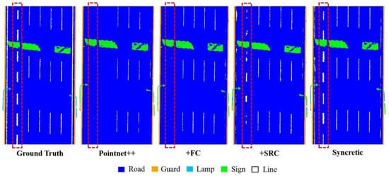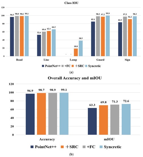 Figure 14 shows the performance of the fusion network model with both the SRC module and the channel attention mechanism added compared with the original network and other single-module networks. As shown, we can see the fusion network model generated by adding the two modules can still learn the features of streetlights under the condition of sparse point clouds, which significantly improves the accuracy of streetlight segmentation. Moreover, the segmentation accuracy of all other features has been significantly improved: the single-class IOU of guardrail is improved from 85.1% to 99.9%, the single-class IOU of signage is improved from 83.5% to 98.3%, and the IOU of lane lines is improved from 52.6% to 66.2%. The fusion network model achieved an overall segmentation accuracy of 99.1% for the test area de improved by 2.2% compared with the original network. The mIOU reached 72.6%, improved by 9.3%, proving that the fusion network generated by adding two modules at the same time has excellent segmentation effect on MLS point clouds data and has been effectively improved in all aspects. The road surface is the feature that achieves the best segmentation results for all network models, achieving more than 96%, as the main element of the scene, with an adequate amount of point clouds data that is relatively evenly distributed and has very similar characteristics. In contrast, the segmentation of the lane lines is relatively poor, with only 66.2% accuracy, which is because the lane line and the road surface, as adjacent features, have the same point clouds data density, which leads to problems in the segmentation of the two features at the junction, and the segmentation results at the junction are easily confused. Some of the lane lines are easily recognized as the road surface.