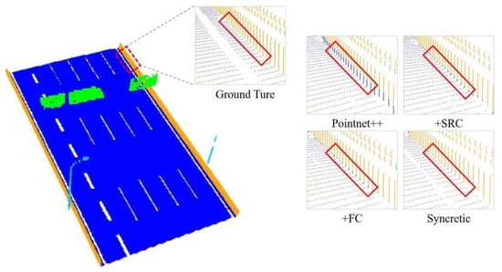 First, we trained a Pointnet++ [] original network model on the newly created MLS point clouds dataset, and then added the SRC sampling module to Pointnet++ [] to replace the original ball sampling module, trained a new model with the MLS point clouds dataset, and then selected the same area for segmentation testing and validation to obtain the test results. From Figure 8, we can see that the new network with the SRC module added effectively segmented the sparse road point clouds at more distant locations, and the sparse lane line point clouds data at the edges were also segmented. Compared with the original already segmented near lane lines, SRC obtained a more accurate and precise segmentation effect.