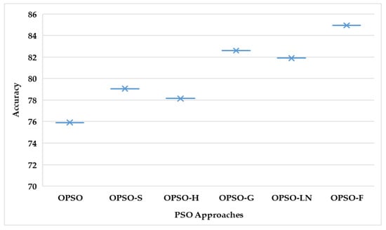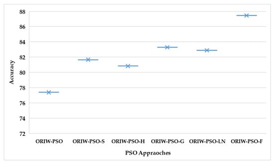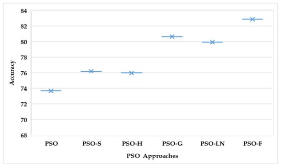 A one-way ANOVA test with a significance level of 0.05 was implemented on testing the accuracy of six PSONN approaches. The result of the one-way ANOVA test is depicted in Table 2. In Table 2, the value of significance is 0.04902, which is less than 0.05, indicating a significant difference between all PSONN variants with a 95% confidence level. Therefore, PSONN variants were significantly different from each other. The one-way ANOVA test results are represented in Figure 10, which shows PSO-F has significantly better results than other PSO approaches. The graph of the ANOVA test shows the PSO-F is significantly distinct from all other PSO approaches.