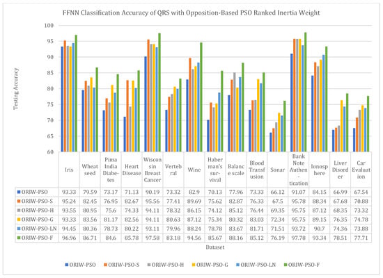 The weights of the feed-forward neural network were trained using opposition-based PSO ranked inertia weight (ORIW-PSO), Sobol with opposition-based PSO ranked inertia weight (ORIW-PSO-S), Halton with opposition-based PSO ranked inertia weight (ORIW-PSO-H), log normal with opposition-based PSO ranked inertia weight (ORIW-PSO-LN), Gaussian with opposition-based PSO ranked inertia weight (ORIW-PSO-G), and Faure with opposition-based PSO ranked inertia weight (ORIW-PSO-F). We prepared a feed-forward neural network using the weight optimisation process. The performance of ORIW-PSO, ORIW-PSO-S, ORIW-PSO-H, ORIW-PSO-G, ORIW-PSO-LN, ORIW-PSO-F and state-of-the-art NN algorithms have been tested on 15 well-known datasets. To evaluate the performance of the proposed ORIW-PSO-F technique, it was compared with variants of PSO such as ORIW-PSO, ORIW-PSO-S, ORIW-PSO-H, ORIW-PSO-G, and ORIW-PSO-LN on fifteen real data sets extracted from UCI. The detail of these fifteen data sets is presented in Figure 13, where ORIW-PSO-F is well-performing on these datasets and shows good results. Simulation results in Figure 13 show that neural network training using the ORIW-PSO-F algorithm performed well and provided better accuracy than other PSO approaches. After simulation, the result is excellent in training the NN using the ORIW-PSO-F algorithm, and shows better precision and accuracy than traditional approaches. The ORIW-PSO-F algorithm can be effectively used for real-world complex statistical problems and data classification problems in the future. The accuracy results of classification problems are depicted in Figure 14, and the accuracy graph is represented in the same figure for fifteen data sets.