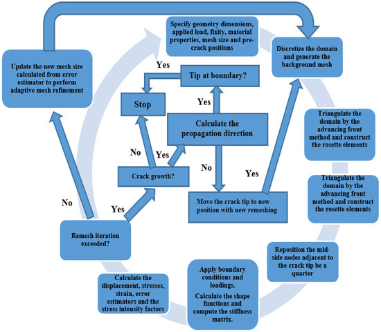 The geometrical dimensions, stresses, material characteristics, and other restrictions are first introduced into the 2D model of crack growth. Incremental stress analysis is performed using the FEM during the pre-processing stage. The SIFs are determined at each step of crack propagation using the displacement extrapolation technique (DET). The crack propagation trajectory is then estimated using the maximum circumferential stress theory (MCST). For the purpose of generating the mesh, the advancing-front method has been implemented. Using this procedure, it is necessary to define the domain boundaries, generate the elements, smooth the mesh, and renumber the nodes [39]. The error estimator provides an estimate of the particular scale of each element, and that estimate is utilized to control the mesh refinement process. The solution’s components, such as stresses, displacements, and strains, among others, are transferred from the old mesh onto the new mesh once the new mesh has been generated. Figure 1 depicts the computational strategy for the crack propagation program.