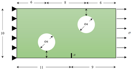As depicted in Figure 10, we consider a square plate that has a single edge crack of 6 mm and four holes with identical radii of 5 mm each. The dimensions of the plate are 100 mm on each side and 10 mm in depth. The top and bottom edges are subjected to a uniformly distributed stress of 10 MPa. The properties of the plate, which is made of the aluminum alloy 7075-T6, are modulus of elasticity, E = 72 GPa, Poisson’s ratio, υ = 0.33, yield strength, σy = 469 MPa, ultimate strength, σu = 538 MPa, and fracture toughness, KIC = 3288.76 MPa .