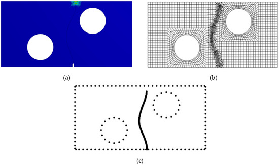 The predicted crack growth trajectory (Figure 11a) was in agreement with a variety of studies that used other ways of modeling, such as the fast multipole method (FMM) with the boundary element method (BEM) [46] (Figure 11b), the boundary cracklet method [47] (Figure 11c), and improved smoothed particle hydrodynamics [48] (Figure 11d). As seen in Figure 11d, there was a little divergence in the crack trajectory that was observed by Wiragunarsa et al. [48] when compared to the path that was predicted by the developed program and the two crack propagation paths that were addressed by [46,47].