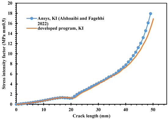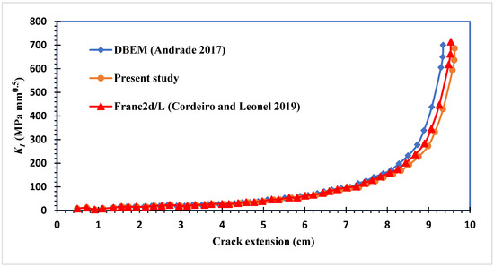 Figure 8 depicts the history of the first mode of stress intensity factors achieved by the developed program in comparison to the DBEM values and Franc2d/L proposed by [44,45], respectively. As can be seen in Figure 9, the final deformation that was obtained as the result of this study was similar to the deformation that had been predicted by [44] using a dual boundary element.