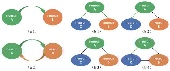Schematic diagram of motif model connection ((a-1): Unidirectional coupling of neurons A and B. (a-2): Dual coupling of neurons A and B. (b-1): Unidirectional coupling of neurons A and B, Unidirectional coupling of neurons A and C. (b-2): Dual coupling of neurons A and B, Unidirectional coupling of neurons A and C. (b-3): Dual coupling of neurons A and B, Dual coupling of neurons A and C. (b-4): Dual coupling of neurons A and B, Unidirectional coupling of neurons A and C, Dual coupling of neurons B and C.).